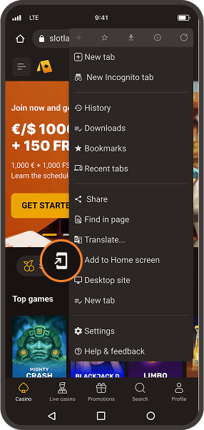 Go to the SlotLair homepage and tap three dots to open the browser menu.