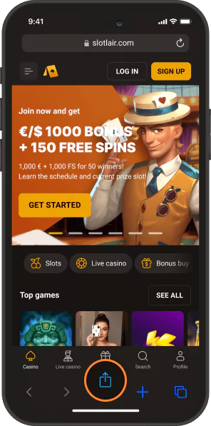Open slotlair.com with Safari, tap “Share” on the bottom navigation panel.